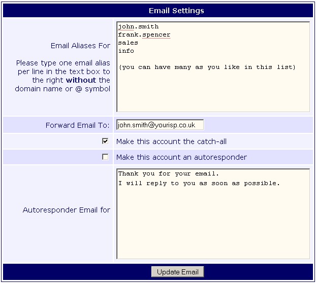 • Enter your own e-mail address for forwarding into the first box - e.g. john.smith@yourisp.co.uk